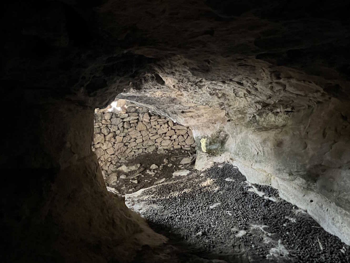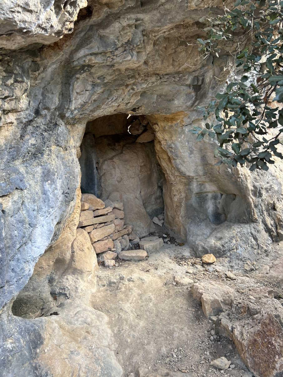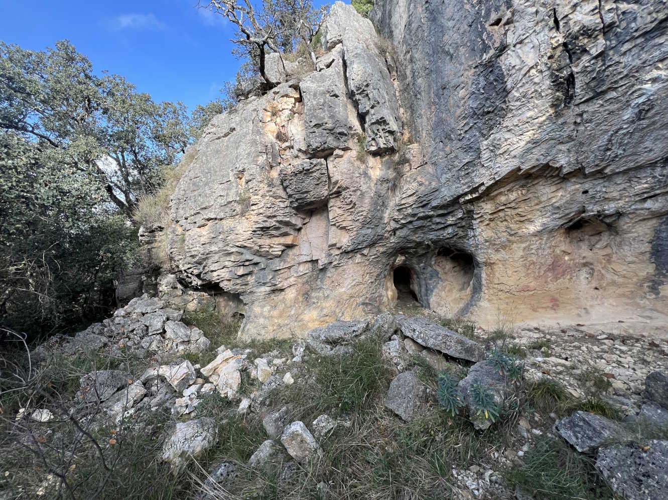 Considerando la suposición expuesta en el apartado "TEMAS PENDIENTES", se trata de un conjunto de covachas y oquedades dispuestas en la base de un pequeño cortado que recorre la zona. La covacha situada más al oeste corresponde a un abrigo de unos 3 metros de visera y unos 25 metros de longitud máxima total, con una zona al este claramente derrumbada. En su extremo este encontramos un recoveco acondicionado con piedra en seco para almacenar agua y un conducto ascendente, de 7 metros de recorrido (posiblemente se trate de una surgencia fósil) con la boca protegida por una pared de piedra en seco. Posiblemente, este extremo este del conjunto, fuese la zona ocupada por los pastores. |
