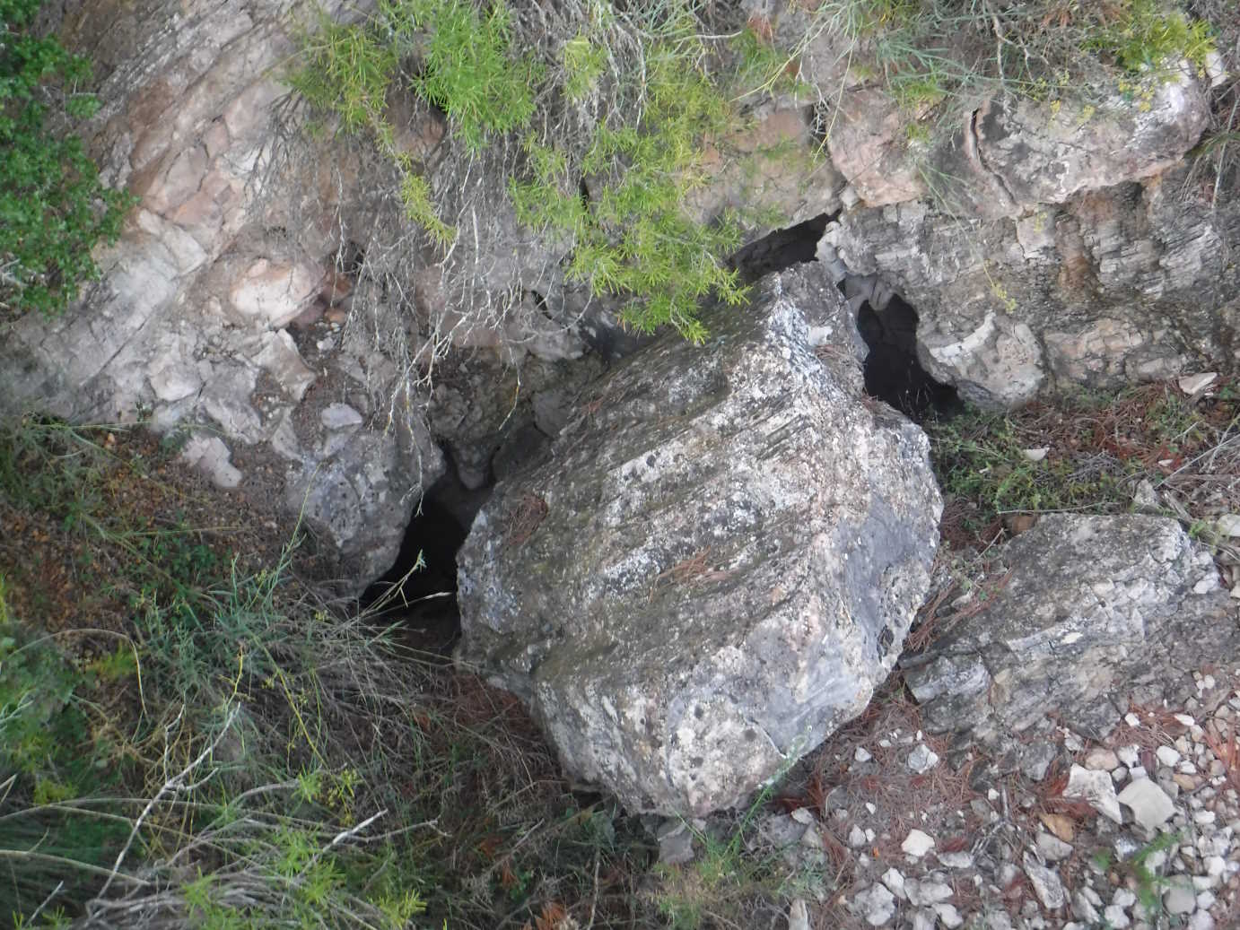 Conjunto de 5 cavidades muy peculiares por su ubicación junto a unos parapetos de la pasada Guerra Civil Española (1936/39), construidos con piedra y argamasa y con una conservación casi perfecta, constituyendo un punto defensivo muy estratégico. La cavidad número 1 es de pequeñas dimensiones. Su boca se localiza tras un gran bloque, mirando al SW, con unas dimensiones de 0'65 metros de altura por 0'85 metros de anchura, descendiendo de forma justa 1 metro y dando a una humilde estancia de 2 metros por 0'80 metros de anchura media y una altura de 0'80 metros. Dirección SW-NE y de forma casi rectangular en su planta. |