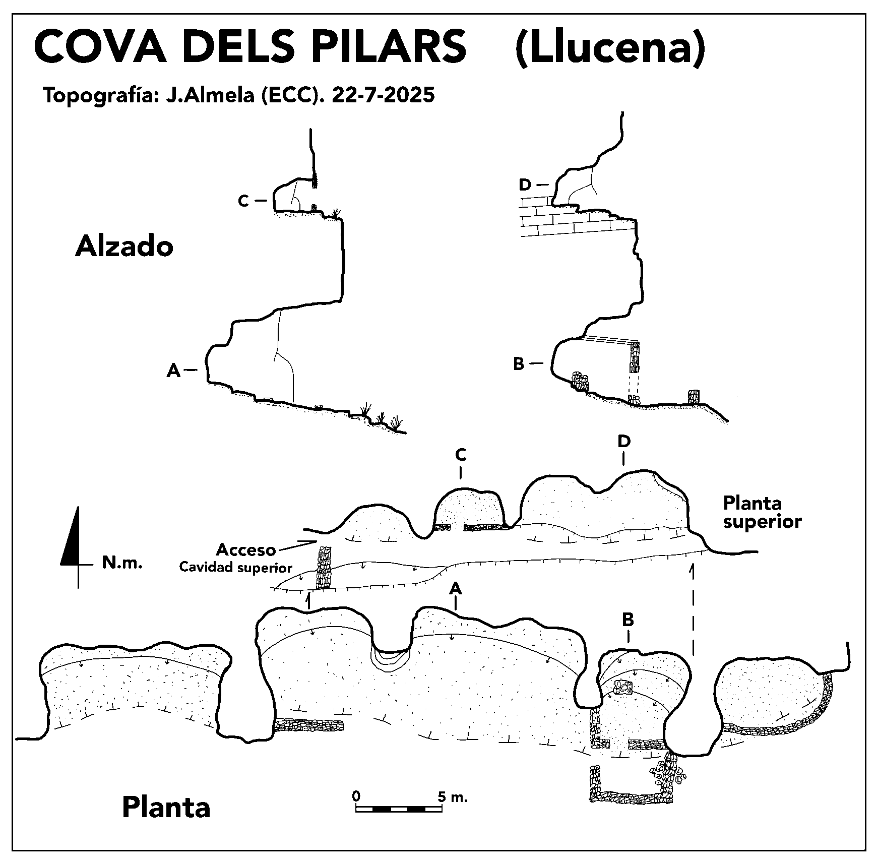 El topónimo de la cavidad es debido a dos gruesos pilares calizos que llaman la atención. En el interior de este abrigo calizo distinguiremos dos zonas, la de la izquierda, más pequeña, orientada al SW, sin muro de piedra, suelo muy irregular, con 17'5 metros de longitud, 7 metros de profundidad en visera y unos 6 metros de altura máxima, zona carente de interés; y la zona de la derecha, la principal, en cuyos extremos diestro y siniestro hay construidos sendos muros de piedra. Esta zona ha sido utilizada para guardar ganado y también para guardar aperos de labranza por los masoveros, concretamente en una caseta de piedra aprovechando el pilar de la derecha como parte de una pared y cuyas dimensiones (las de la caseta) son de 5 x 5 x 3'75 metros de altura hasta unos maderos que hacen de techo previo al techo real que constituye el abrigo de caliza natural. Las dimensiones totales de la cavidad son: 22 metros de longitud x 8'5 metros de profundidad de visera x 6 metros de altura. Como curiosidad podemos señalar que en la pared frontal aparece una pequeña fuentecita colgada a 1'4 metros del suelo, con una balsita (a modo de gour alargado) de agua, de 0'5 metros de longitud por 12 centÃmetros de anchura y 4'5 centÃmetros de profundidad. El suelo de la cueva, repleto de excrementos de cabras domésticas y salvajes, posee un desnivel positivo liviano. En la vertiente exterior de la cavidad se han localizado algunos restos de cerámica prehistórica. |