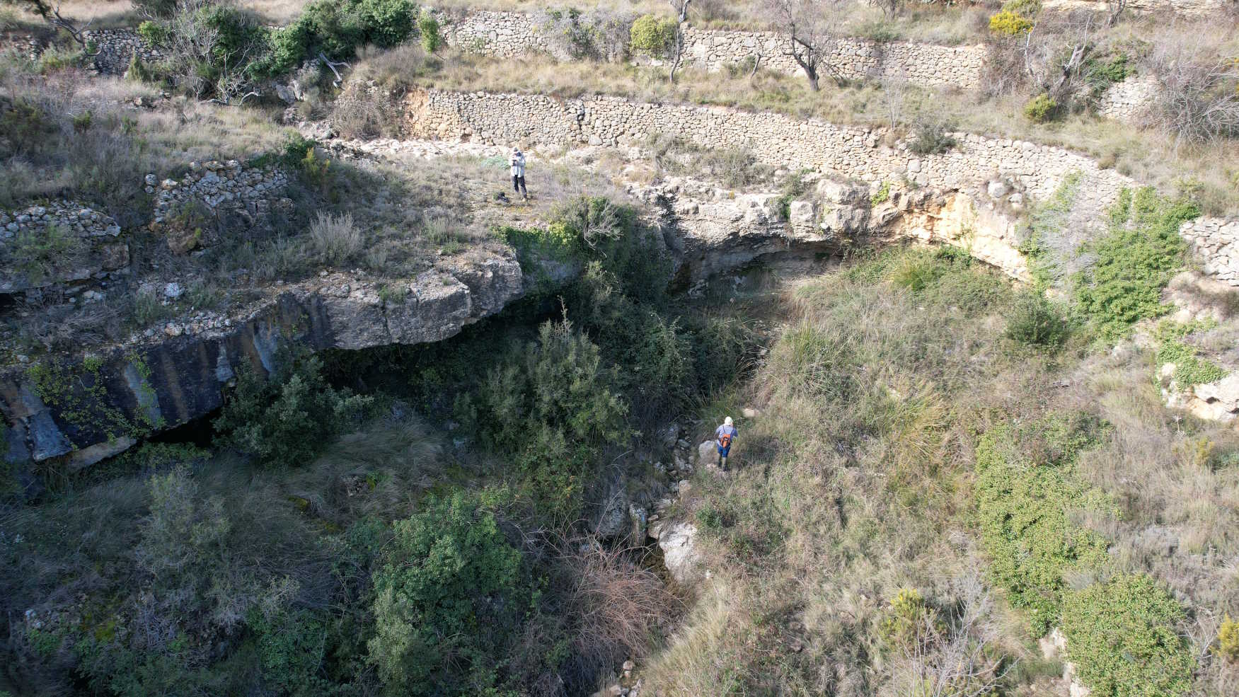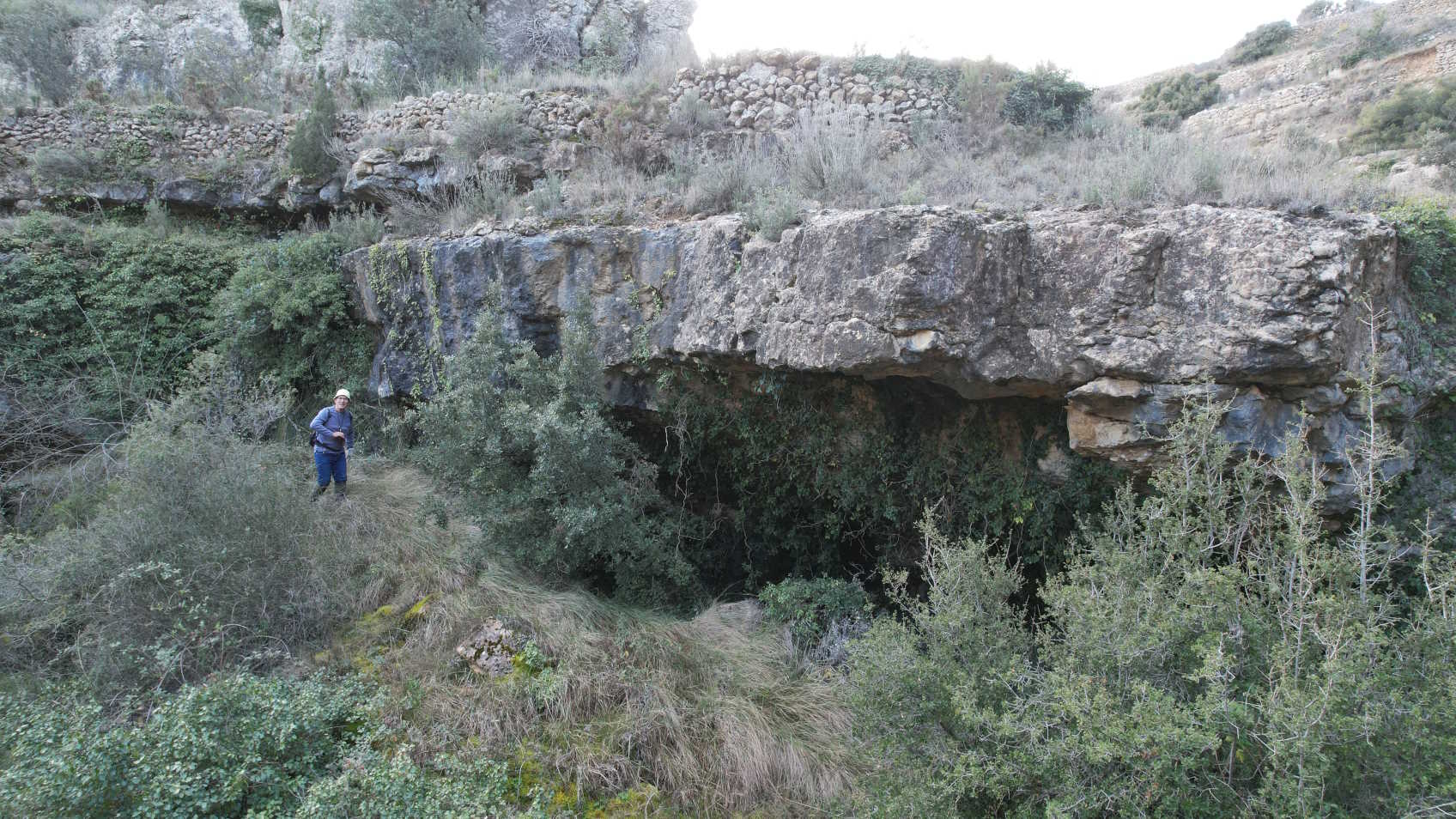 ![]() | Vista general de esta larga covacha de escasa visera, excavada por las aguas del Barranc de la Cadolla (febrero/2026). |