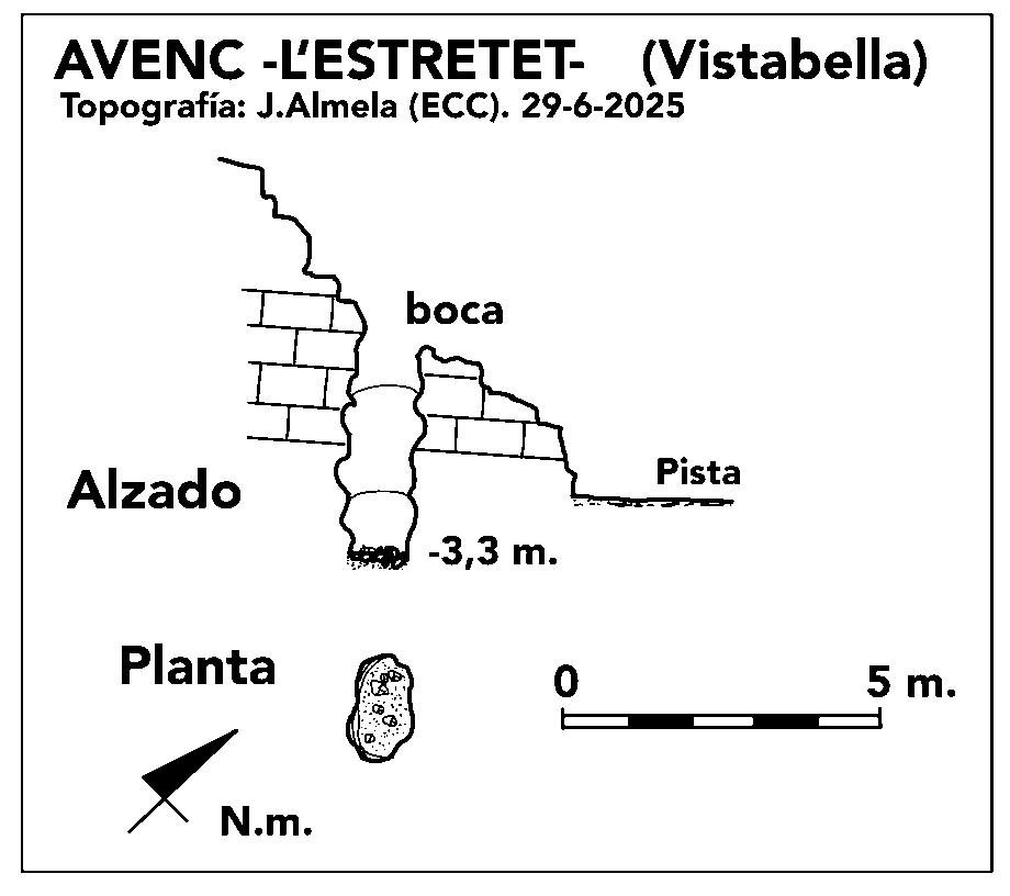 La boca de 1,0 x 0,4 metros conduce a un pequeño pozo de 3,3 metros, con una base de 1,2 x 0,6 metros. Las secciones del pozo presentan una tendencia circular, tratándose de un pequeño pozo de disolución, sumidero fósil, de escaso desarrollo. El topónimo "L'Avenc", situado en esta zona, ya aparece en documentos del siglo XVI. |