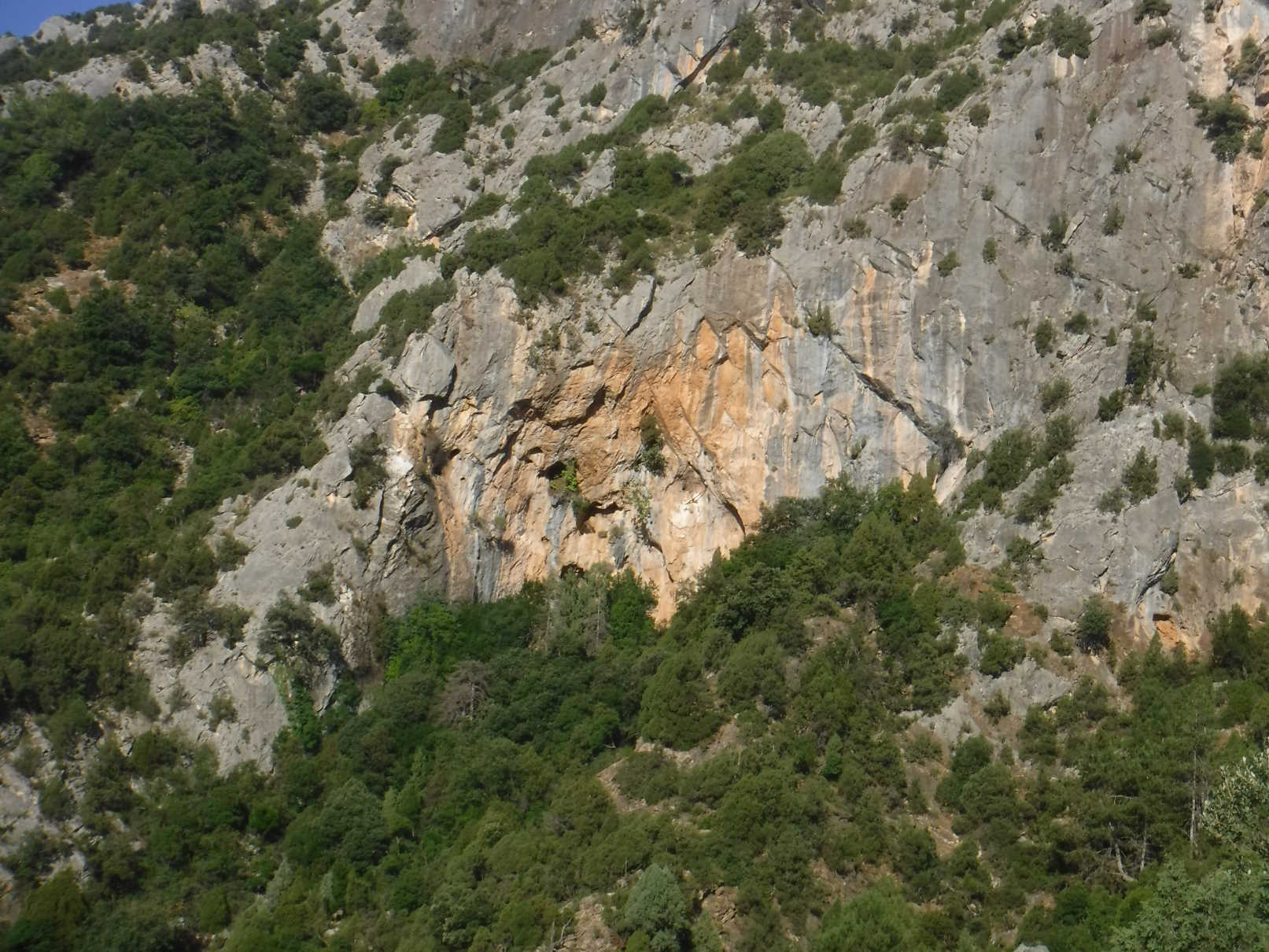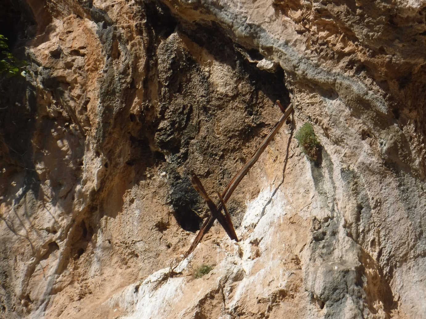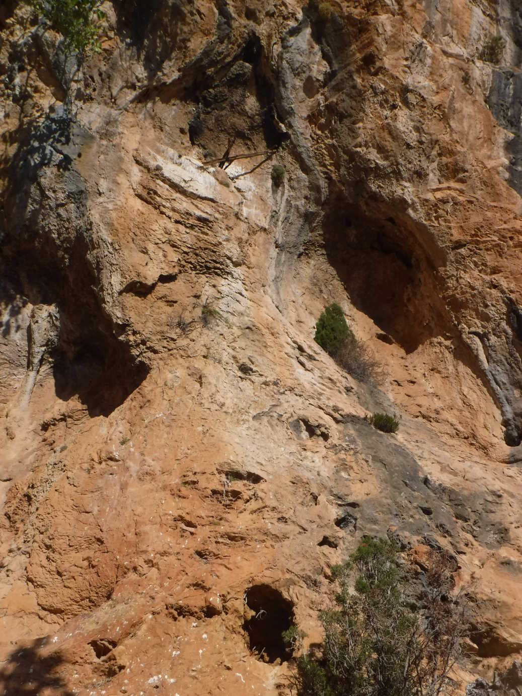 Está formada por un abrigo de unos 35 metros de longitud de boca, donde la visera es mayor en los últimos 19 metros. En la parte inferior del abrigo, siguiendo el risco, hay una pequeña cueva de 3 metros medio colgada. La visera del abrigo es de unos 3 metros. A la derecha del abrigo, a unos 8 metros de altura en una repisa de difÃcil acceso, hay unas estacas clavadas en alto, que constituyen el aspecto más interesante de esta cavidad. Actualmente encontramos dos estacas pequeñas y otra más larga que descansa en las pequeñas. Al lado de las estacas hay un pequeño agujero y la pared parece ahumada. La presencia de estacas en esta cavidad ya fue recogida por Josep Lluis Viciano de la mano de Fidel, masovero de la masÃa de Penyacalva (Culla), en la década de 1970. En la parte más abajo del abrigo, después de un rincón que hace, hay un mojón de piedras situado a unos 2 metros de la pared del cortado, del que desconocemos su uso. |