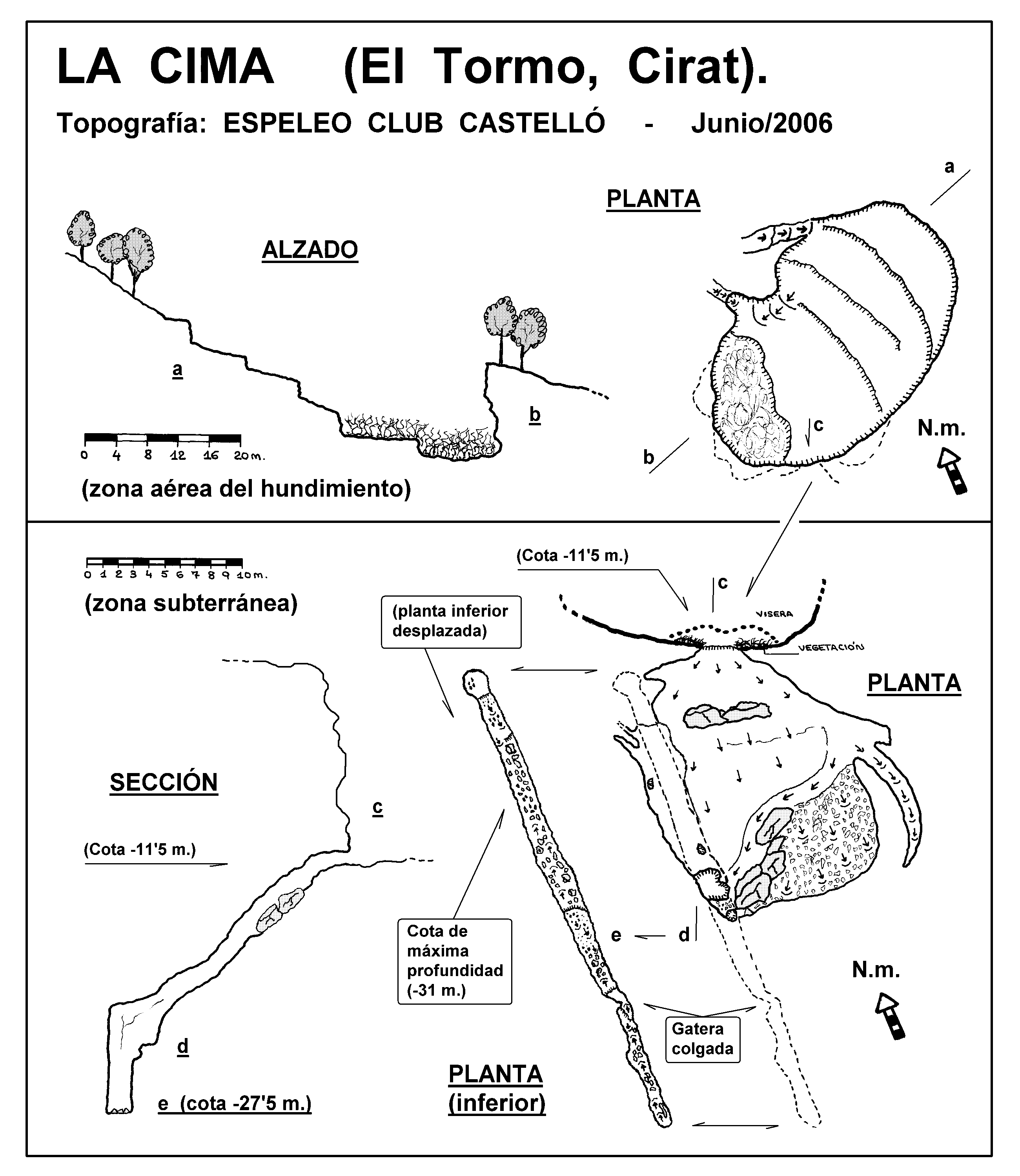 Se trata de una gran depresión en terreno NO cárstico, fruto del hundimiento del mismo y a la que se puede acceder cómodamente y de forma escalonada por su flanco norte. Lo que primero llama la atención son las espectaculares dimensiones de este hundimiento: 38 metros de longitud por 25 metros de anchura y -18 metros de profundidad máxima desde el borde superior de "La Cima". En su fondo, la exuberante vegetación dificulta el paso para alcanzar la boca de la parte subterránea. Para la exploración de la parte subterránea se necesita material técnico de descenso. La parte subterránea presenta coladas parietales brillantes por la humedad de la pared oeste de la galerÃa inferior. Los datos espeleométricos de la parte subterránea, son los siguientes: - Recorrido en planta: 70 metros. - Recorrido real: 85 metros. - Desnivel máximo: -19'50 metros (cota de acceso a esta parte, desde el borde inmediato superior a la boca: -11'50 metros). - Recorrido de la planta inferior: 32 metros. |