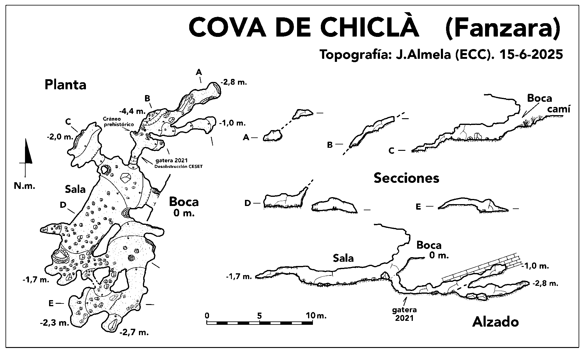 Cavidad subterránea excavada en roca caliza y en forma de cueva. Su boca de acceso se asoma al SE 130º, con 1,20 metros de altura x 1,40 metros de anchura. Penetramos en ella de forma descendente y prácticamente escalonada -1,50 metros, apareciendo una alargada sala de aspecto casi rectangular (14,00 metros x 3,75 metros de anchura media x 1,40 metros de altura media), con ciertos huecos de escasa importancia al cegarse de inmediato y siempre de modo agaterado. En el sector NW, y con el techo muy bajo, observamos bonitos goures con agua y donde las reconstrucciones litoquÃmicas existentes se hallan menos mutiladas. A 3 metros de distancia de la boca de acceso a la cueva, hacia el sur, encontramos una gatera de 0,60 metros de anchura que nos permite pasar a la zona más atractiva desde el punto de vista espeleo-deportivo: 15,00 metros de recorrido en planta con techos muy bajos (entre 0,70 metros y 1,10 metros de altura), y donde llegaremos a recorrer tres salitas. Una segunda gatera, que nos obliga incómodamente a reptar sobre suelo de pedruscos, de nuevo nos devolverá a la sala principal. Según la información oral vertida por el Sr. Rogelio Gil, de Tales, recuerda que hace muchos años se podÃa entrar a ella de pie, sin agacharse. Comenta que es fruto de haber tirado y rellenado el suelo con muchÃsimo material externo. Actualmente, el denominador común de la cueva estriba en su techo bajo. En el año 2021 y tras unos trabajos de desobstrucción realizados por el grupo de espeleologÃa de Tales (CESET), se accedió a nuevos espacios subterráneos, donde se localizaron diversos huesos humanos y cerámica prehistórica, todos los restos fueron depositados en el museo de la Diputación Provincial. Más información sobre este descubrimiento junto con una entrevista a un arqueólogo que está estudiando esta cavidad sepulcral, en el vÃdeo DESCUBRIMIENTO ARQUEÓLOGICO, inédito HALLAZGO en las PROFUNDIDADES en una CUEVA de ESPAÑA, del canal de YouTube EN LA VERTICAL (22/07/2021). Esta nueva zona se ubica en el sector de entrada, hacia el norte. Se inicia con una rampa-resalte de 1,5 metros rellena de tierra y donde en su base se desobstruyó una corta gatera horizontal. Justo después de la gatera, en una pequeña estancia y en el lateral izquierdo es donde se localizó un cráneo. En esta zona también se localizó cerámica a mano, de la Edad del Bronce. De este punto parten dos estrechas galerÃas de 7 y 9 metros respectivamente, que van más o menos paralelas. En un lateral, mediante un estrecho resalte se alcanza la cota -4,4 metros, punto más profundo de cueva. La génesis de la cavidad es de tipo estructural, estando más o menos influenciada por el buzamiento de los estratos. |