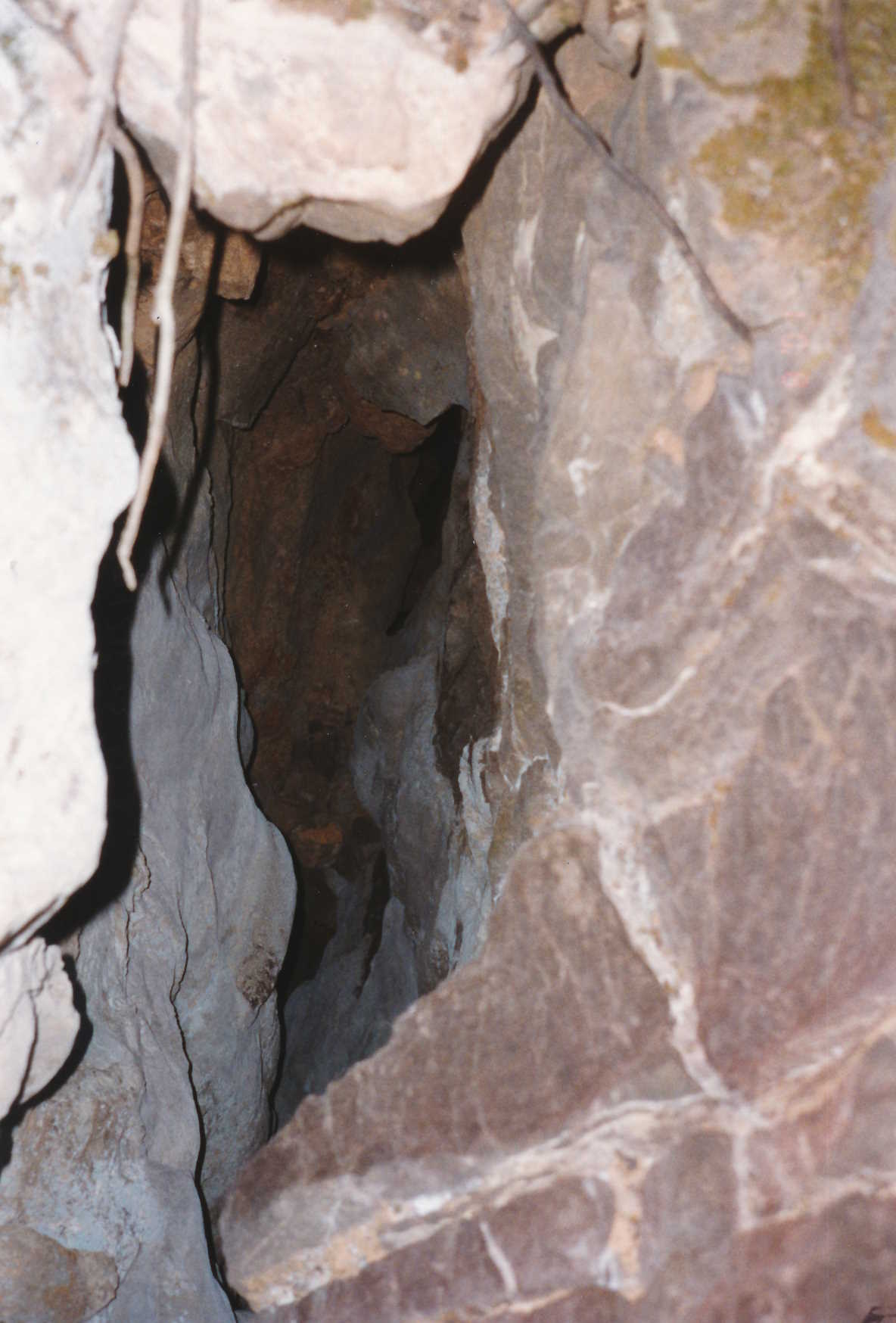 ![]() | Estrecha fractura perpendicular que cierra esta cavidad y supuestamente comunica con la cercana Sima Soler (Febrero/2001). |
