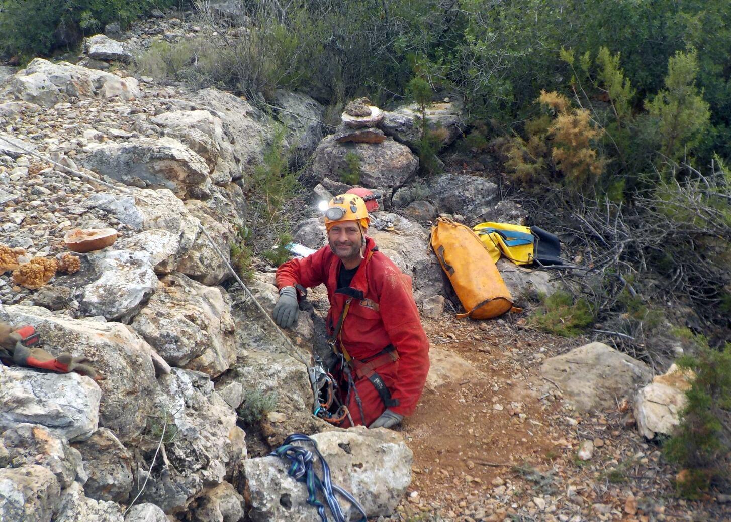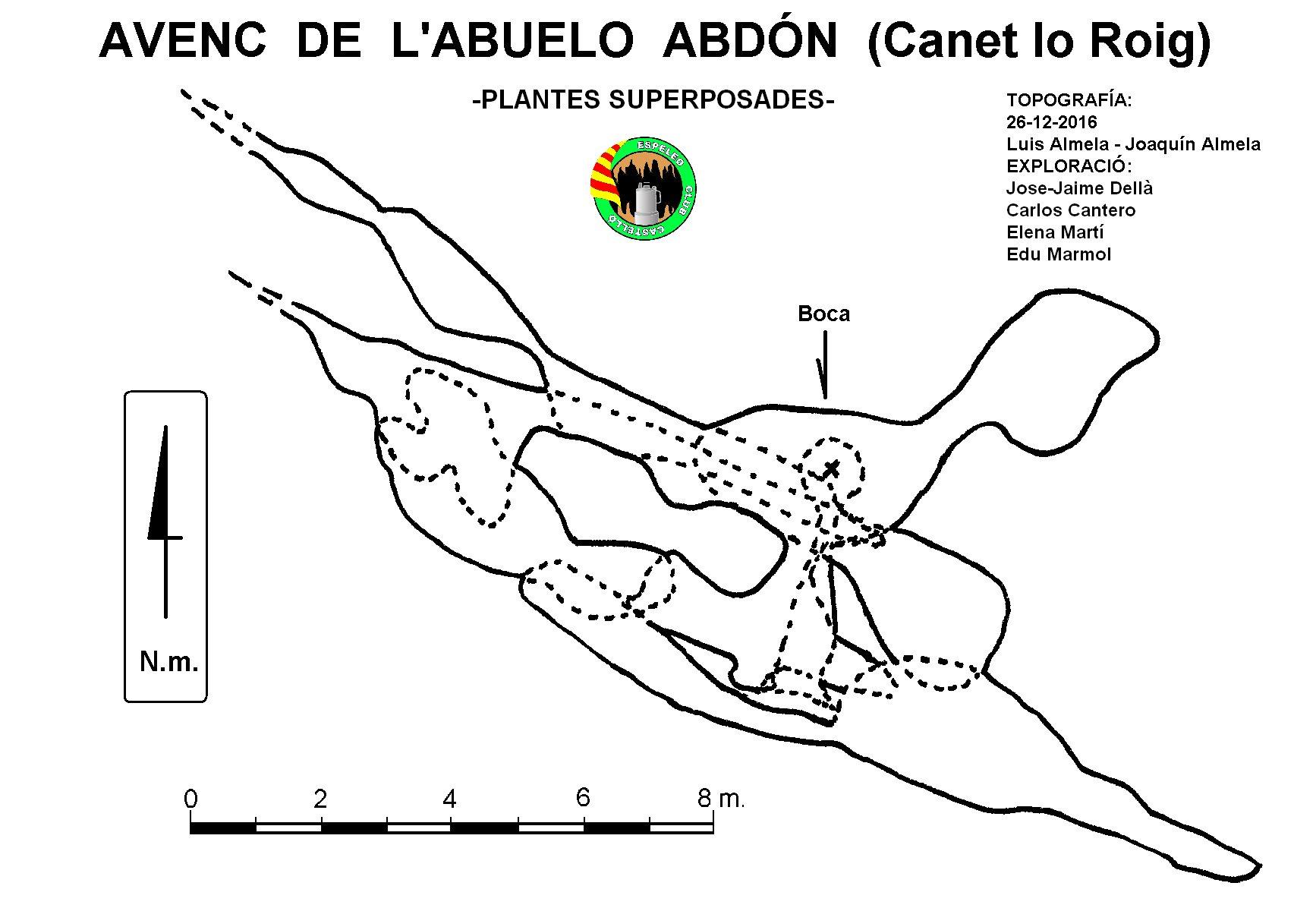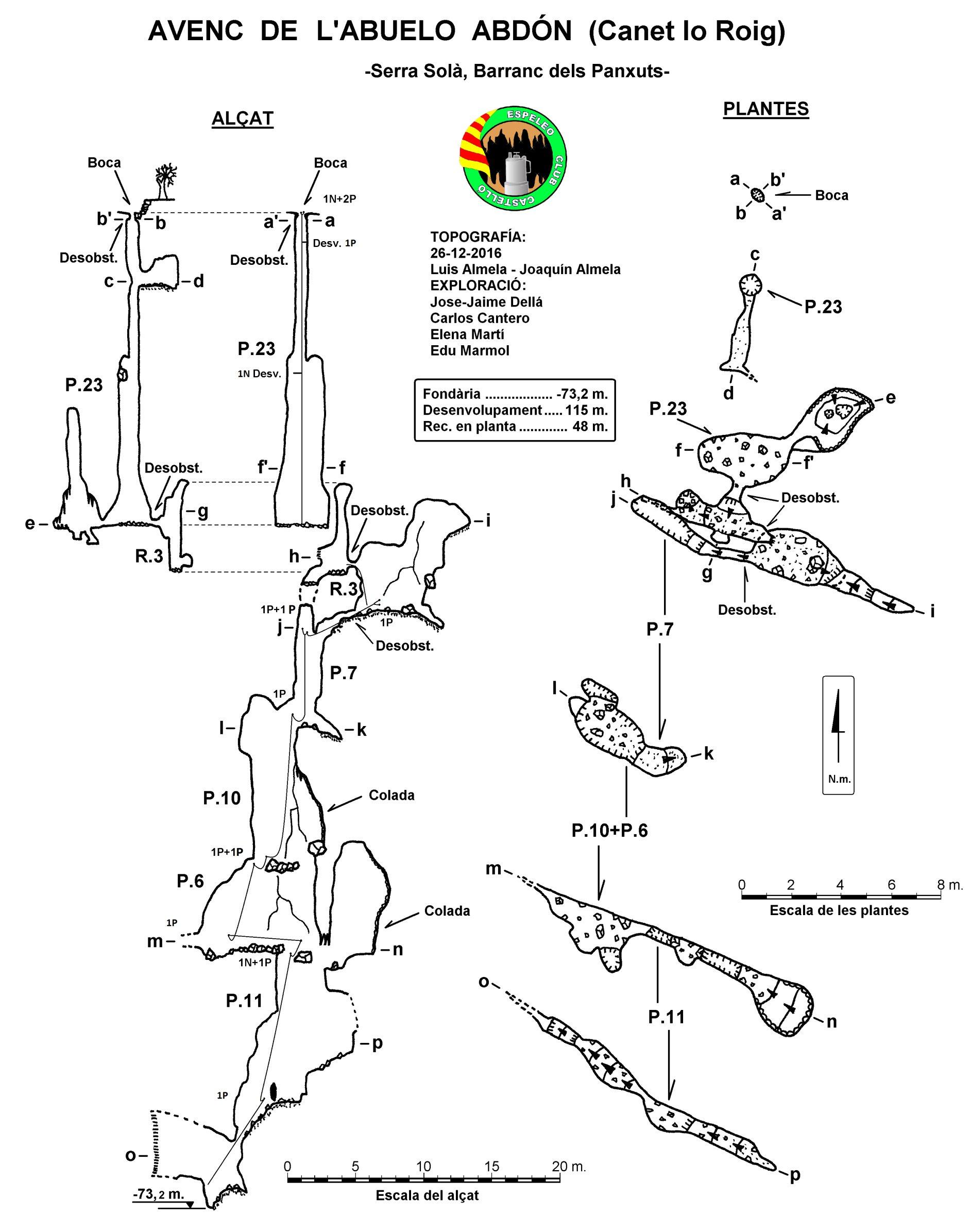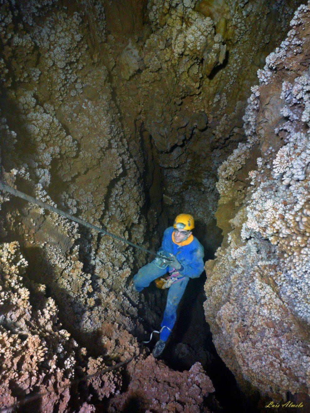 A pesar que se conocÃa desde antaño la existencia de un pequeño boquete, por el que se lanzaban piedras a gran profundidad, no fue hasta principios del año 2016, cuando se procedió a ensanchar el diminuto agujero, para poderlo explorar desde el punto de vista espeleológico. Esta sima está formada por un pozo fusiforme inicial, de 23 metros de profundidad, que desemboca en una fractura por la que se puede descender a otros pozos más cortos, hasta alcanzar la cota de -72,5 metros de profundidad. La estrecha boca de la cavidad da paso a un pozo cilÃndrico de 23 metros de profundidad pero de pequeña sección en su zona inicial. En la cota de -5 metros encontramos una corta galerÃa de 3 metros en dirección sur. En la parte final del pozo (a partir de la cota de -11 metros), éste se amplÃa, hasta alcanzar el suelo con una planta de 3,5 x 2 metros. En el extremo NE de la base del pozo, encontramos una gatera que da paso a una salita muy concrecionada y con una chimenea de unos 9 metros. Por el contrario, en la parte sur de la base del pozo, tras una gatera desobstruida, accedemos a un resalte de 3 metros. A partir de este punto, las fracturas predominan sobre las formas erosivas, pues tanto el pozo de entrada, como la chimenea ascendente de 9 metros, presentan una morfologÃa erosiva, producto de su antiguo funcionamiento como sumidero. En la parte inferior del resalte de 3 metros se alcanza una fractura de unos 4 metros de longitud, con dirección E-W como el resto de la cavidad. En su extremo oeste, una fisura de apenas 10 centÃmetros comunica con el pozo de 7 metros que da inicio a una serie de pozos que nos conducirán hacia el fondo de la sima. Aunque para poder continuar bajando, hemos de superar una acrobática estrechez, también desobstruida, seguida de un resalte de 3 metros. Bajo de este resalte, alcanzamos otra pequeña salita de 4 x 2 metros, desde donde parte, hacia el este, una galerÃa con fuerte inclinación ascendente y que poco a poca va cerrándose tras 8 metros de recorrido. A nivel de suelo de la salita, pero en dirección oeste, encontramos una nueva estrechez que marca el inicio de una serie de pozos muy concrecionados. El primero de los pozos, de 7 metros de profundidad, da paso a un segundo de 10 metros y a continuación, el último de 6 metros. En los empotramientos entre estos pozos, y en sus paredes, encontramos todo tipo de formaciones totalmente activas y de diferentes coloraciones, dando a estas zonas de la sima, una extraordinaria belleza. Destacan las delicadas excéntricas, pero también encontramos estalactitas, estalagmitas, banderas y coladas. Estos pozos están estructurados sobre una diaclasa, que presenta una intensa corrosión por parte de las corrientes de agua que la han ampliado. Posteriormente ha tenido lugar una fase de recubrimiento litoquÃmico que le ha conferido su belleza actual. Debajo de estos tres pozos encadenados encontramos una pequeña zona de desarrollo horizontal. En la sala donde nos deja el último pozo podemos observar zonas agrandadas por la disolución y corrosión de las aguas captadas del exterior. Continuando hacia el este, nos encontraremos con una estrecha fractura en el suelo. Se trata del inicio del último pozo de la sima. Por el contrario, si continuamos avanzando por esta estrecha grieta, con las paredes recubiertas de excéntricas, llegaremos a una pequeña salita con una chimenea, lugar donde se ha formado una atractiva colada. Se trata de uno de los rincones más atractivos de toda la cavidad. El último pozo de esta sima está constituido por una estrecha vertical de 11 metros de profundidad, bajo la cual aún resta una rampa y un resalte precedido de una estrechez muy selectiva. En esta zona se alcanza la máxima profundidad de la sima, situada en la cota de -73,2 metros. |