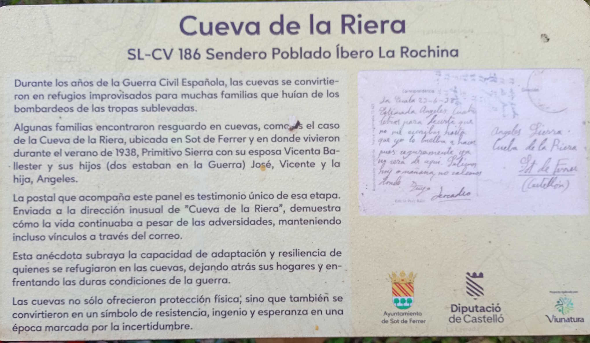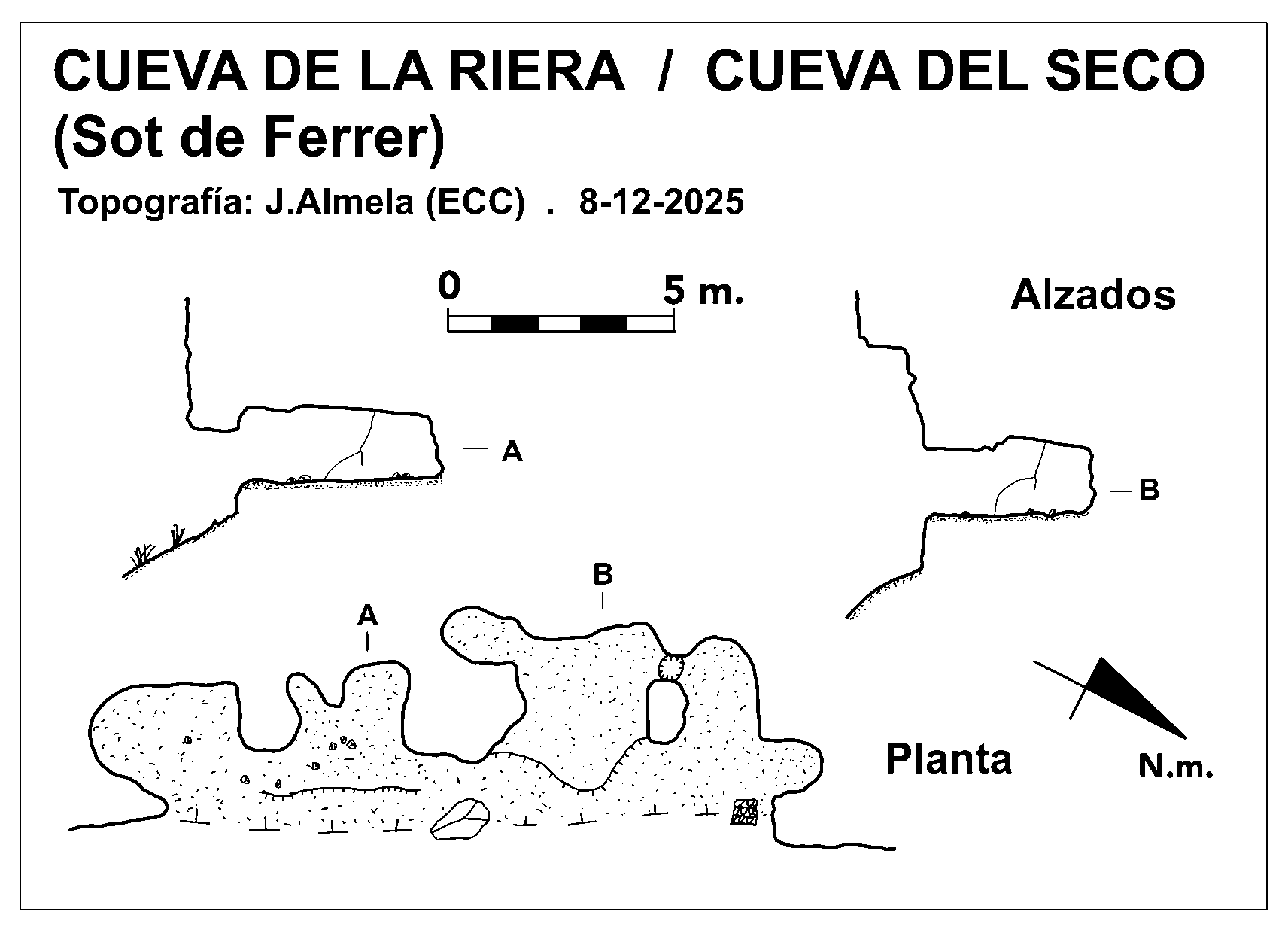 Se trata de un conjunto de pequeñas oquedades excavadas en terreno de conglomerados, más consistentes en unas zonas que en otras, con algunos bloques caídos al pie de la pared, por lo que es posible que estas cavidades fueran mayores en algún momento; en el extremo de la derecha existe un ventanuco abierto y/o consolidado artificialmente con yeso (se aprecia en las fotografías correspondientes), lo que indicaría algún tipo de uso en el pasado. Las 5 oquedades se han numerado de izquierda a derecha del 1 al 5, siendo las dos últimas de la derecha las más pequeñas y la número 2 la de mayor volumen, con una anchura máxima de 3,70 metros, altura máxima de 2 metros y un desarrollo de visera de 5,60 metros. El topónimo de estas cavidades aparece reflejado en una cartografía del año 1907 (planimetría base para la elaboración de la primera edición de las hojas cartográficas a escala 1:50.000 del Instituto Geográfico Nacional) como "Senda de la Cueva del Seco". Durante la pasada Guerra Civil (1936/39) estas cavidades sirvieron de refugio para muchas personas, tal como aparece reflejado en 2 imágenes adjuntas, con la particularidad de que en esa época, estas cuevas parece que se conocían como "Cueva de la Riera" (véase el apartado de imágenes). |