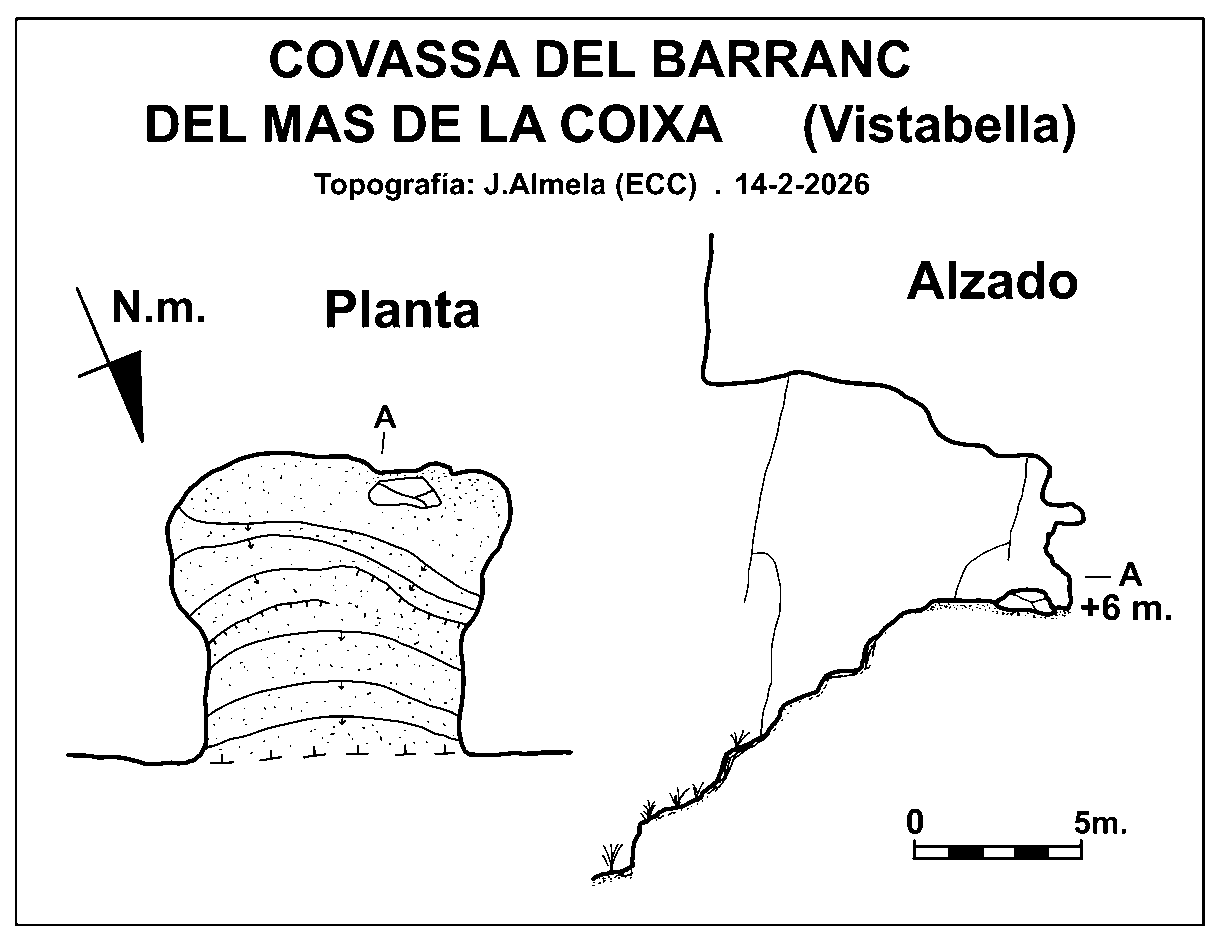 Se trata de diversos abrigos con gran boca pero de escasa visera. Posiblemente alguno tenga topónimo singular, aunque debido a lo despoblado que se encuentra esta zona, en la actualidad ya resulta imposible averiguarlo. La cavidad denominada número 1 está orientada al noreste, con unas dimensiones de 8 metros de ancho por 12 de alto. Hay que realizar una pequeña trepada para llegar a ella. Se trata de una cavidad ascendente de 15 metros de recorrido y un desnivel de +6 metros. En la parte superior hay una plataforma que forma un rellano de 4 x 6 metros. Es refugio de cabras, existiendo numerosos excrementos. La Covassa 2 del Barranc del Mas de la Coixa se encuentra a unos 45 metros en lÃnea recta al SW de la número 1, y en un cortado orientado al este. |