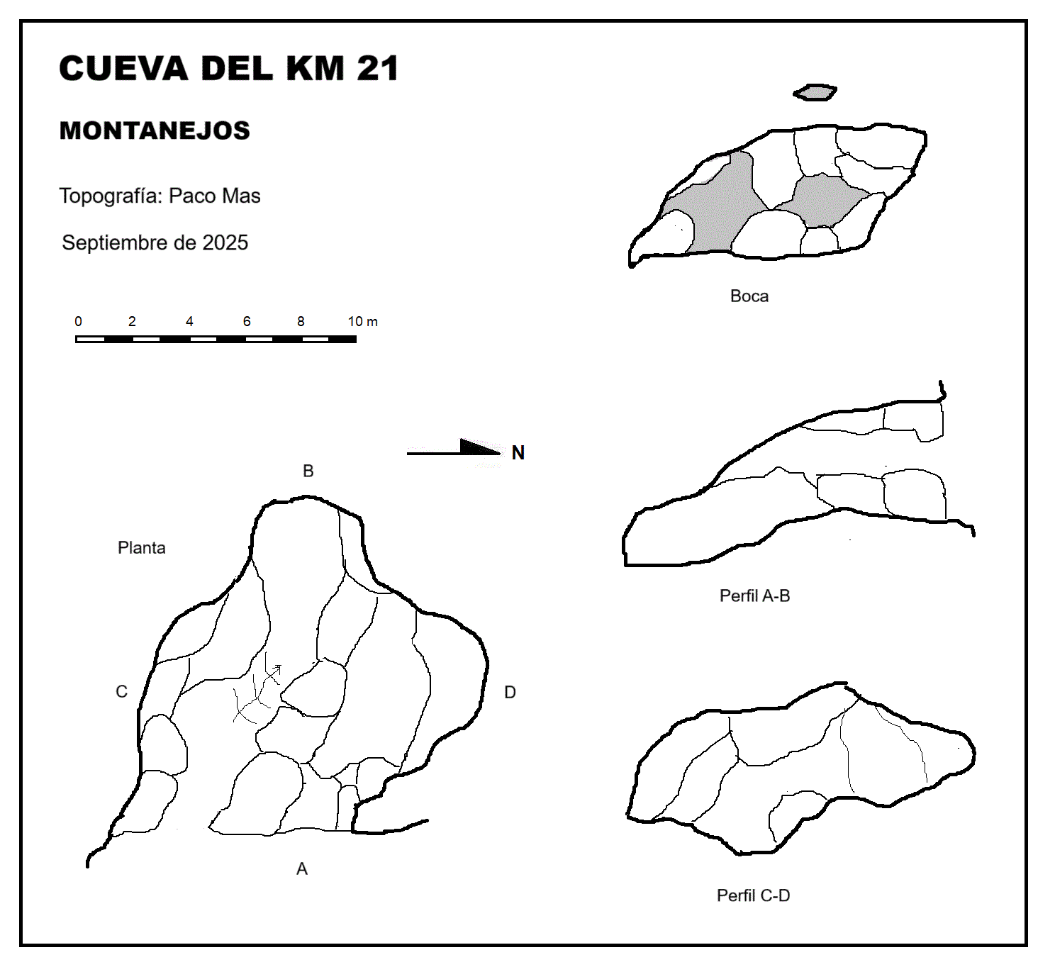 Aunque la boca es una, está dividida en dos accesos principales (y otros más pequeños) al interior de la cavidad por unos grandes bloques; por cada uno de tales accesos se entra a un nivel diferente, más alto el de la derecha, comunicados por el interior de la cueva. El interior de la cavidad es algo caótico por la disposición de bloques y salas. Dentro de la cavidad, pese a su irregularidad, pueden apreciarse tres zonas, la de acceso, una sala un poco más profunda, y otra sala un poco más alta. La boca principal mide 3 metros de alta por 5 metros de ancha. La boca superior más elevada debe tener aproximadamente 4 metros de ancha por 1,5 metros de alta. Actualmente es usada como abrigo por la fauna salvaje, pero es muy posible que antaño fuese utilizada como corraliza. |