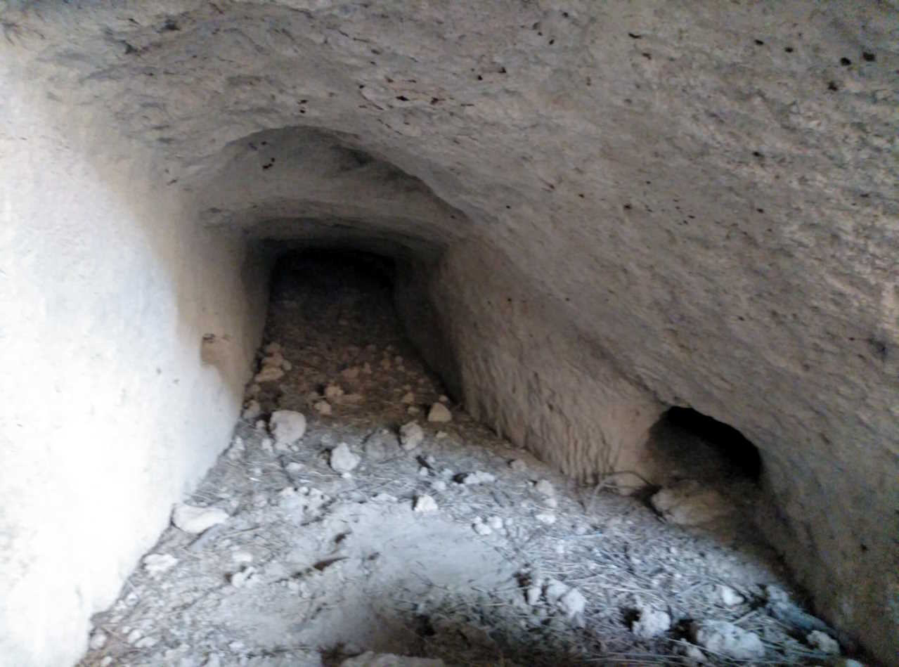 Refugio excavado (junto con algún otro de dimensiones minúsculas) en la base de un desnivel entre bancales en desuso, formado por materiales blandos, caracterizado por una hilera de agujeros en lo alto que aparentan haber servido de apoyos para algún tipo de estructura; dispone de dos bocas, la más pequeña, la izquierda, de difÃcil acceso por acumulación del material desprendido de la pared; la galerÃa interior se va reduciendo en altura por acumulación de materiales que no parecen proceder del propio interior (el techo y las paredes se conservan aparentemente como originalmente). - Dimensiones de la boca grande: anchura máxima de 1,40 metros por una altura máxima de 0,80 metros. - Dimensiones de la boca pequeña: anchura máxima de 0,60 metros y altura máxima de 0,30 metros. - Dimensiones interiores: la anchura se va reduciendo desde los 2,40 metros hasta los 0,60 metros; la altura se va reduciendo desde 1 metro hasta 0,20 metros. Desarrollo subterráneo: unos 5,70 metros. |